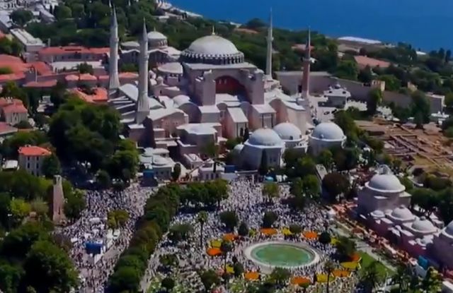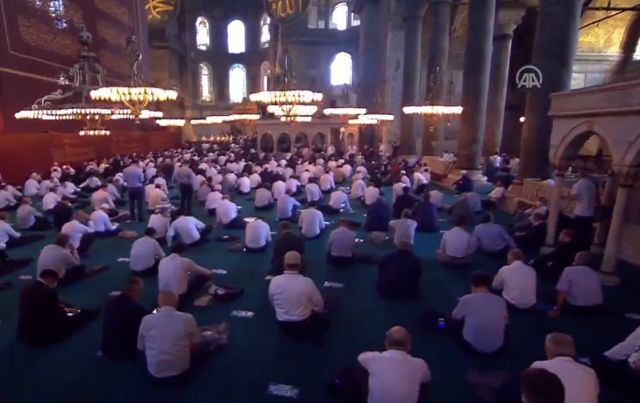 Κοντά στις 12.00 το μεσημέρι ο Ρετζέπ Ταγίπ Ερντογάν εισήλθε στην Αγία Σοφία για να προσευχηθεί. Οι εικόνες που μεταδίδονται έξω από την Αγία Σοφία παραπέμπουν σε πανηγύρι ή σύναξη τζιχαντιστών.