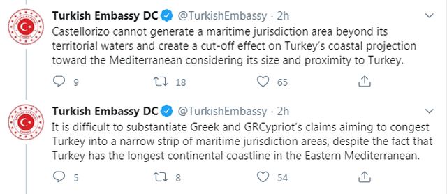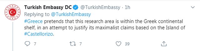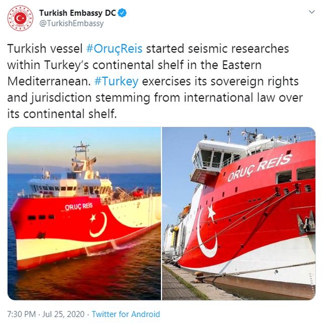 Συγκεκριμένα υπήρξε tweet από την τουρκική πρεσβεία στην Ουάσιγκτον σύμφωνα με το οποίο το Oruc Reis άρχισε σεισμικές έρευνες στην ανατολική Μεσόγειο!