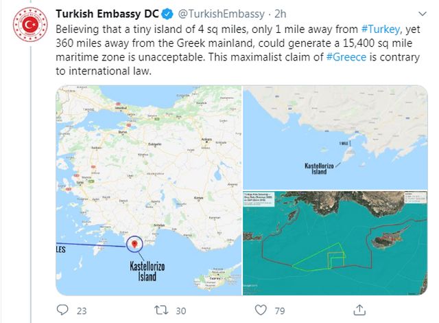 «Πιστεύοντας ότι ένα μικρό νησί 4 τετραγωνικών μιλίων, μόλις 1 μίλι μακριά από την Τουρκία, αλλά 360 μίλια μακριά από την ελληνική ηπειρωτική χώρα, θα μπορούσε να δημιουργήσει μια θαλάσσια ζώνη 15.400 τετραγωνικών μιλίων είναι απαράδεκτο. Αυτός ο μαξιμαλιστικός ισχυρισμός της Ελλάδας είναι αντίθετος με το διεθνές δίκαιο».