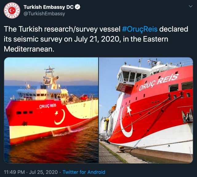 Το απόγευμα του Σαββάτου (25.07.2020) έγινε γνωστό ότι μερικά από τα πολεμικά πλοία της Τουρκίας έφευγαν από την περιοχή και επέστρεφαν στους ναυστάθμους, ενώ λίγο αργότερα η πρεσβεία των Τούρκων στην Ουάσιγκτον γνωστοποίησε με tweet ότι το Oruc Reis ξεκίνησε σεισμικές έρευνες στην «υφαλοκρηπίδα» της Τουρκίας στην ανατολική Μεσόγειο.