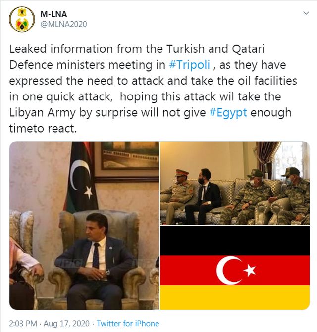 Σύμφωνα με πληροφορίες που επικαλείται ο ανεπίσημος λογαριασμός του Λιβυκού Εθνικού Στρατού (LNA) στο Twitter, Τούρκοι και Καταριανοί εξέφρασαν την ανάγκη έναρξης αιφνιδιαστικής επίθεσης στα ανατολικά της Λιβύης, στη γραμμή Σύρτης – Αλ Τζούφρα, με στόχο την κατάληψη των πετρελαϊκών εγκαταστάσεων, που ελέγχονται από τον Λιβυκό Εθνικό Στρατό (LNA), της Βουλής των Αντιπροσώπων, υπό τη διοίκηση του στρατάρχη Χαφτάρ.