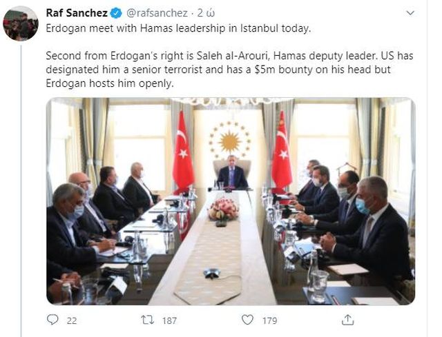 Όπως μεταδίδει το Hellas Journal, αυτή τη φορά ήταν η σειρά του ανταποκριτή του NBC, Raf Sanchez, ο οποίος σχολιάζοντας τη φωτογραφία από τη συνάντηση του Τούρκου Προέδρου με εκπροσώπους της τρομοκρατικής παλαιστινιακής οργάνωσης Χαμάς, η οποία ελέγχει τη Λωρίδα της Γάζας, επισημαίνει ότι στη φωτογραφία, δεύτερος από τα δεξιά του Ερντογάν, διακρίνεται ο καταζητούμενος από τις αμερικανικές Αρχές, υπαρχηγός της Χαμάς, Σαλίχ Αλ Αρούρι, ο οποίος έχει επικηρυχθεί από τις ΗΠΑ για πάνω από 5 εκατομμύρια δολάρια