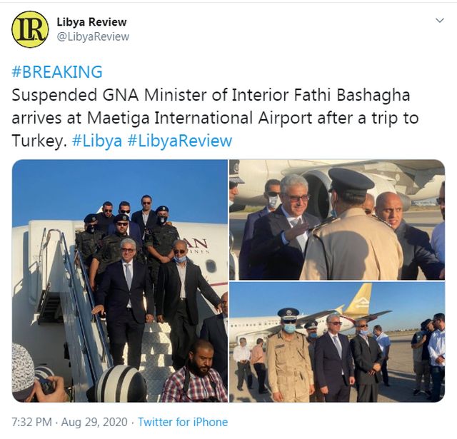 Την Παρασκευή το Προεδρικό Συμβούλιο της ισλαμιστικής Κυβέρνησης Εθνικής Συμφωνίας (GNA) της Λιβύης αποφάσισε την παύση του υπουργού Εσωτερικών της Τρίπολης, Φατί Μπασάγκα (Fathi Bashagha), από τα καθήκοντά του και ενώ αυτός βρισκόταν στην Τουρκία πραγματοποιώντας συναντήσεις με τον υπουργό Άμυνας, Χουλουσί Ακάρ και τις τουρκικές μυστικές υπηρεσίες MIT.