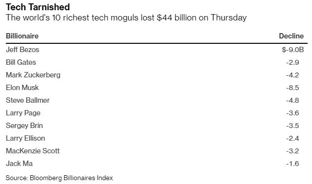 Tο αστρονομικό ποσό των 44 δισ. δολαρίων έχασαν μέσα σε μία ημέρα οι δέκα πλουσιότεροι επιχειρηματίες του τεχνολογικού κλάδου, οι μετοχές των οποίων σημείωσαν «βουτιά» στη Wall Street.