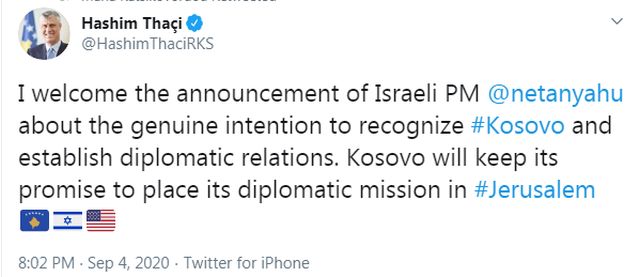 Ο πρόεδρος του Κοσόβου, Χασίμ Θάτσι, με ανάρτησή του στο Twitter, έκανε γνωστό ότι το Κόσοβο θα εγκαταστήσει την πρεσβεία του στην Ιερουσαλήμ, αναγνωρίζοντάς την έτσι ως πρωτεύουσα του Ισραήλ.