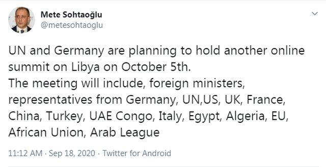 Ηνωμένα Έθνη και Γερμανία σχεδιάζουν νέα Διάσκεψη -τηλεδιάσκεψη για την ακρίβεια- για τη Λιβύη στις 5 Οκτωβρίου, γράφει στο Twitter ο δημοσιογράφος Μετέ Σοχτάογλου.
