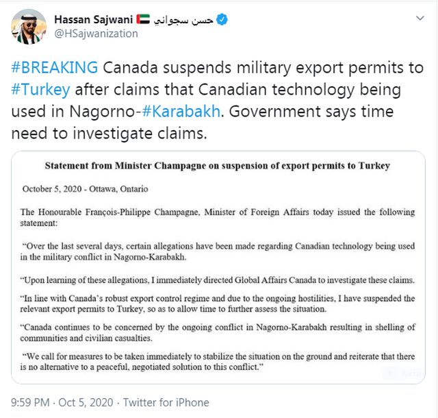 «Με βάση το αυστηρό καθεστώς ελέγχου των εξαγωγών του Καναδά και υπό το φως των συνεχιζόμενων εχθροπραξιών, ανέστειλα τις σχετικές άδειες εξαγωγής προς την Τουρκία, ώστε να δοθεί χρόνος για να εξεταστεί καλύτερα η κατάσταση», ανέφερε ο υπουργός Εξωτερικών Φρανσουά Φιλίπ Σαμπανί σε ανακοίνωση που εξέδωσε σύμφωνα με το ΑΠΕ – ΜΠΕ.