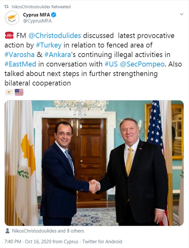 Σύμφωνα με ανάρτηση στον επίσημο λογαριασμό του υπουργείου Εξωτερικών της Κυπριακής Δημοκρατίας στο Twitter, ο κ. Χριστοδουλίδης συζήτησε με τον κ. Πομπέο τις τελευταίες προκλητικές ενέργειες της Τουρκίας στην περίκλειστη πόλη της Αμμοχώστου, τις συνεχιζόμενες παράνομες δραστηριότητές της στην Ανατολική Μεσογειο, καθώς και τα επόμενα βήματα στην ενίσχυση της διμερούς συνεργασίας Κύπρου-ΗΠΑ.