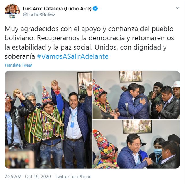 «Το MAS κέρδισε με διαφορά τις εκλογές, για τη Γερουσία και τη βουλή των αντιπροσώπων. Ο Άρτσε είναι πρόεδρος της Βολιβίας», δήλωσε στους δημοσιογράφους στο Μπουένος Άιρες.