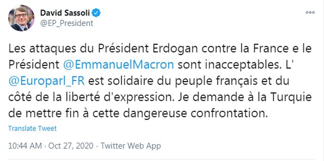 «Απαράδεκτες» χαρακτήρισε τις επιθέσεις του Ταγίπ Ερντογάν προς τη Γαλλία και τον Εμμανουέλ Μακρόν ο πρόεδρος του Ευρωπαϊκού Κοινοβουλίου με ανάρτησή του στο Twitter.