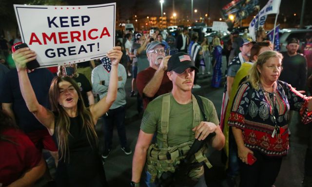 Στο μεταξύ μια ομάδα υποστηρικτών του Τραμπ, κάποιοι από τους οποίους ήταν οπλισμένοι με τουφέκια και πιστόλια, συγκεντρώθηκε έξω από εκλογικό κέντρο στην Αριζόνα χθες Τετάρτη το βράδυ, καθώς είχαν διαδοθεί φήμες ότι οι ψήφοι υπέρ του Ρεπουμπλικάνου προέδρου δεν καταμετρώνται σκοπίμως.