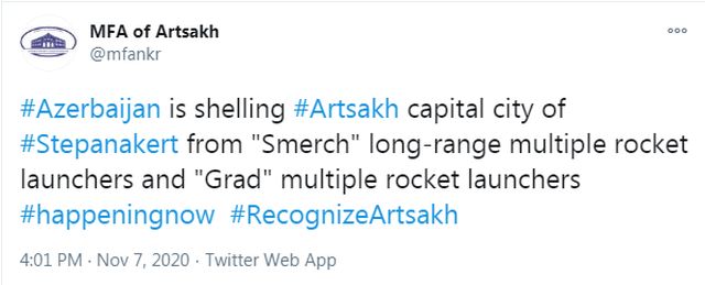 Το υπουργείο Εξωτερικών της Δημοκρατίας του Αρτσάχ αναφέρει, σε αναρτήσεις του το Σάββατο στο Twitter ότι, το Αζερμπαϊτζάν βομβαρδίζει αρμενικές πόλεις.