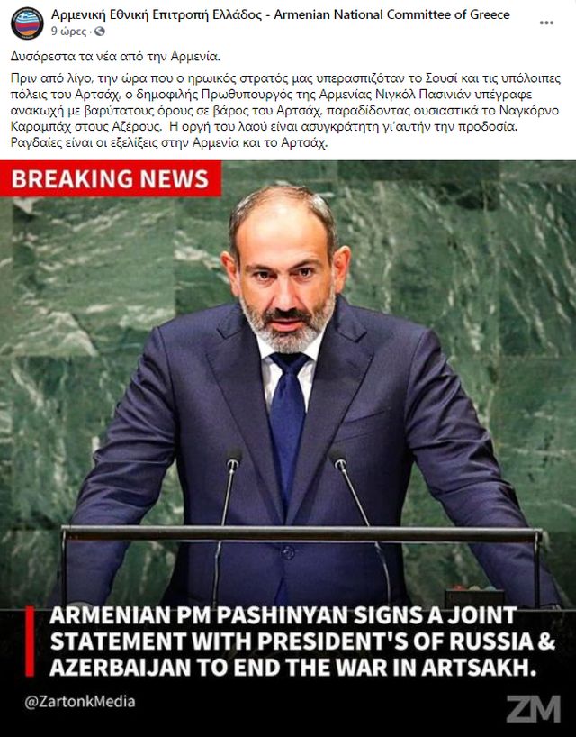 »Πριν από λίγο, την ώρα που ο ηρωικός στρατός μας υπερασπιζόταν το Σουσί και τις υπόλοιπες πόλεις του Αρτσάχ, ο δημοφιλής Πρωθυπουργός της Αρμενίας Νιγκόλ Πασινιάν υπέγραφε ανακωχή με βαρύτατους όρους σε βάρος του Αρτσάχ, παραδίδοντας ουσιαστικά το Ναγκόρνο Καραμπάχ στους Αζέρους.