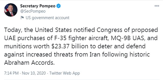 «Αυτό είναι σε αναγνώριση της εμβάθυνσης της σχέσης μας και της ανάγκης των Ηνωμένων Αραβικών Εμιράτων για προηγμένες αμυντικές δυνατότητες, για να αποτρέψουν και να αμυνθούν ενάντια σε αυξημένες απειλές από το Ιράν», πρόσθεσε.