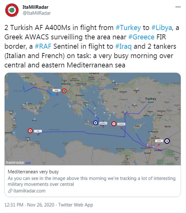 Σήμερα Πέμπτη, δύο τουρκικά μεταγωγικά A400Ms απογειώθηκαν από την Τουρκία με προορισμό τα αεροδρόμια που ελέγχει στη Λιβύη μαζί με το ισλαμιστικό καθεστώς του Τουρκολίβου Σαράτζ.