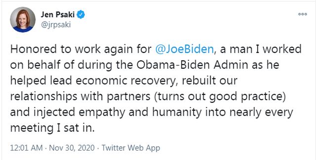 «Είναι μεγάλη μου τιμή να εργάζομαι ξανά για τον Τζο Μπάιντεν, έναν άνδρα που εκπροσώπησα τα χρόνια της κυβέρνησης Ομπάμα-Μπάιντεν και παρακολούθησα να συμβάλει καίρια στην οικονομική ανάκαμψη και στην ανοικοδόμηση των σχέσεών μας με τους εταίρους μας, αλλά και να εμποτίζει με ενσυναίσθηση και ανθρωπιά κάθε σύσκεψη στην οποία ήμουν παρούσα» έγραψε σε ανάρτησή της η Τζεν Ψάκη μετά την ανακοίνωση για τη νέα της θέση.
