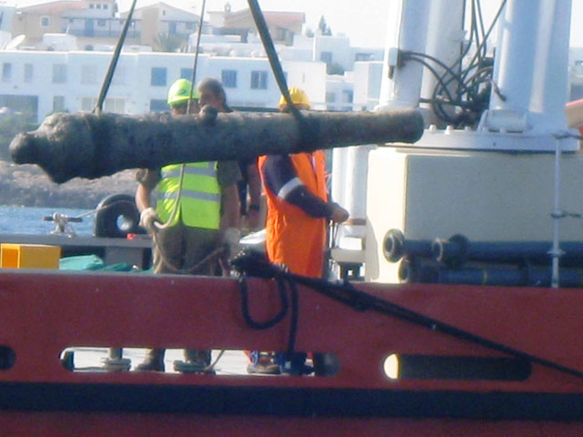Από τις προηγούμενες μέρες όλα ήταν έτοιμα και την Κυριακή οι δύτες προσάρτησαν απλώς τους γάντζους στα σκοινιά με τα οποία προσδέθηκε το κανόνι και ένας γερανός στο ειδικό πλοίο των αρχαιολόγων το ανέβασε πάνω από την επιφάνεια του νερού. Το ρολόι έδειχνε 3.50 το απόγευμα, όταν το κανόνι, σκουριασμένο αλλά επιβλητικό, ξεπρόβαλε από τους αφρούς της θάλασσας και ξανάδε τον ήλιο.