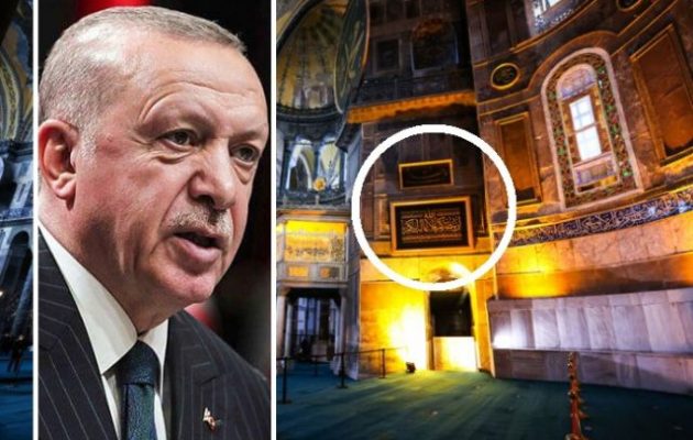 Ο Ρετζέπ Ταγίπ Ερντογάν έγραψε το όνομά του μέσα στην Αγία Σοφία. Όχι με… σπρέι, αλλά προσφέροντας καλλιγραφική επιγραφή με στίχους από το Κοράνι, ως αναθεματική πλάκα, όπου και αναγράφεται στο τέλος ότι, αφιερώθηκε στην Αγία Σοφία από τον Ρετζέπ Ταγίπ Ερντογάν με αφορμή τη λειτουργία της ξανά ως τζαμί. Την επιγραφή φιλοτέχνησε ο καλλιτέχνης Μεχμέτ Οζτζάι (Mehmet Özçay).