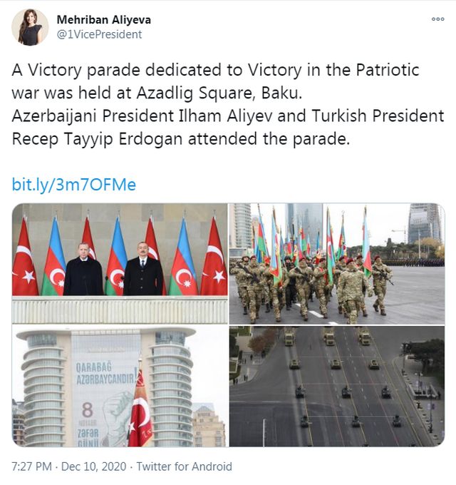 Φωτογραφίες από την παρέλαση ανάρτησε στο Twitter η Μεχριμπάν Αλίεβα, σύζυγος του δικτάτορα Αλίεφ, βουλευτής, πρώτη κυρία του Αζερμπαϊτζάν και αντιπρόεδρος της κυβέρνησης.