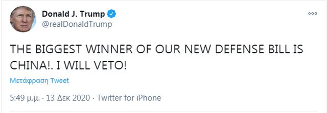 «Ο μεγαλύτερος κερδισμένος από το αμυντικό μας νομοσχέδιο είναι η Κίνα! Θα ασκήσω βέτο!».