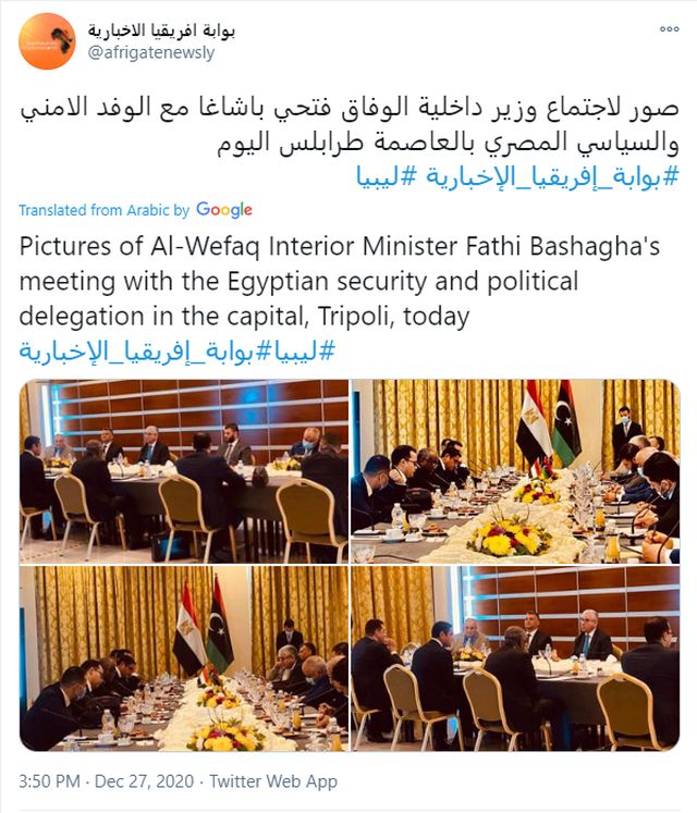 Η αιγυπτιακή αντιπροσωπεία, σύμφωνα και με εικόνες (φωτογραφία πάνω) που δόθηκαν στη δημοσιότητα, συναντήθηκε με τον υπουργό Εσωτερικών της Κυβέρνησης Εθνικής Συμφωνίας (GNA), Φατί Μπασάγκα.