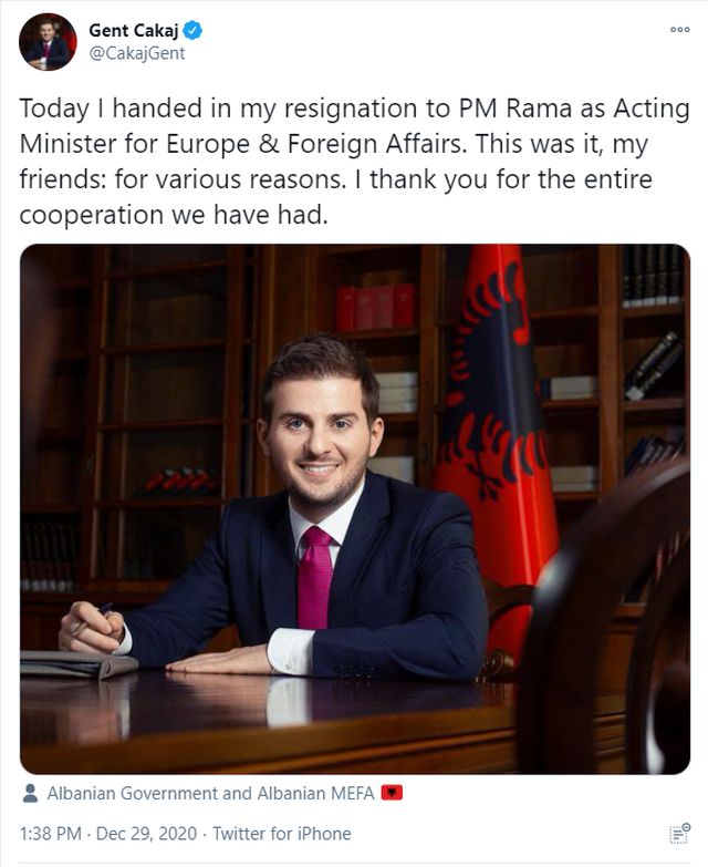Η Αλβανία είχε έναν νεαρό Κοσοβάρο, ένα «θείο βρέφος» εκλεκτό του Έντι Ράμα, τον Γκεντ Τσάκαϊ, να εκτελεί καθήκοντα υπουργού Εξωτερικών. Ο νεαρός υπέβαλλε την παραίτησή του.