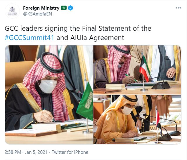 Οι ηγέτες των έξι χωρών του Συμβουλίου Συνεργασίας του Κόλπου υπέγραψαν στη συνέχεια δύο έγγραφα: τη διακήρυξη της Αλ-Ούλα, όπου διεξάγεται η σύνοδος κoρυφής στη βορειοδυτική Σαουδική Αραβία, και ένα τελικό ανακοινωθέν.