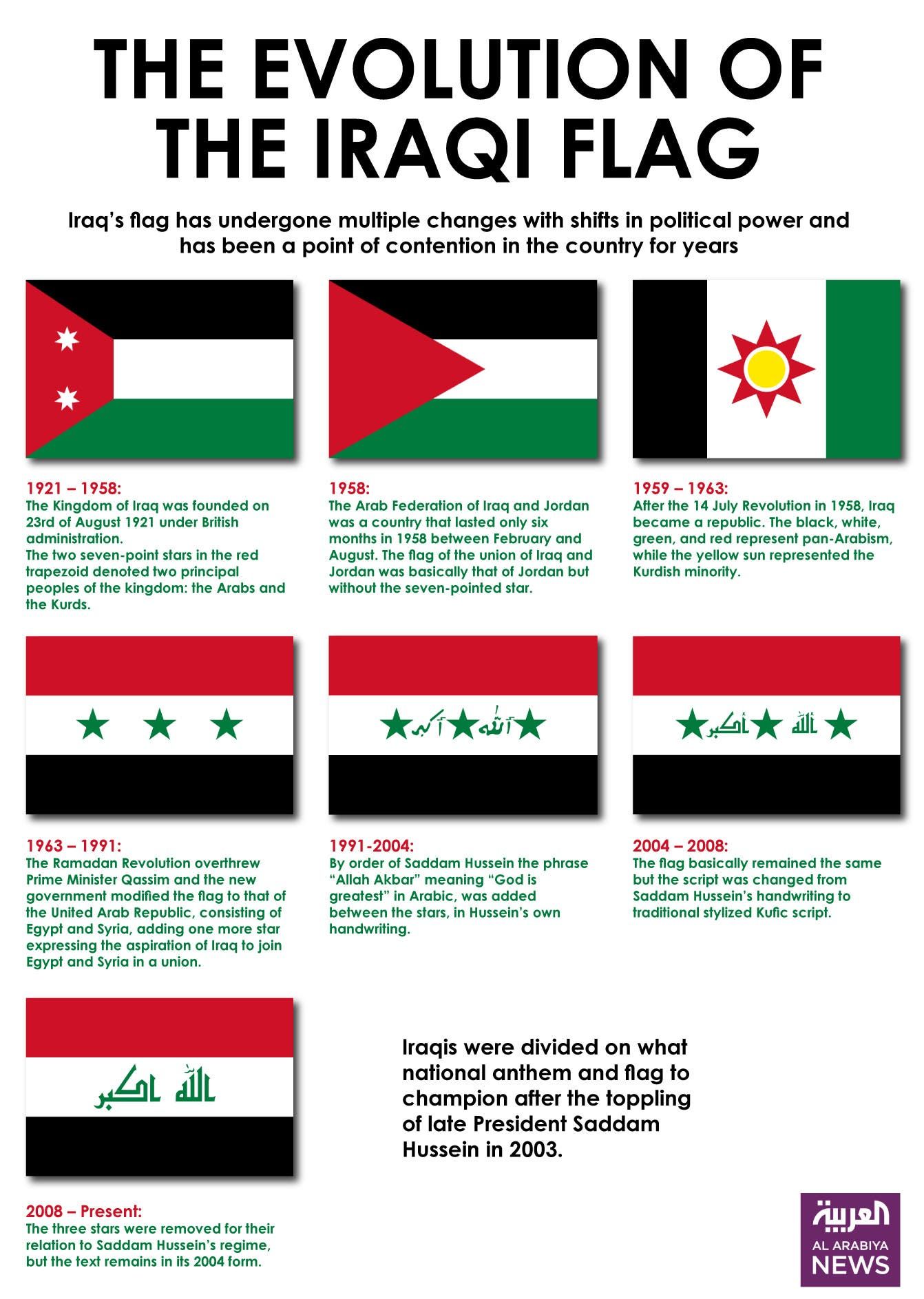 Από το 1921 το Ιράκ έχει αλλάξει επτά φορές εθνική σημαία [μπορείτε να δείτε ΕΔΩ].