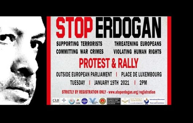 Συγκέντρωση διαμαρτυρίας με κεντρικό σύνθημα «ΣΤΟΠ ΕΡΝΤΟΓΑΝ», «σταματήστε τον Ερντογάν», προγραμματίζεται στις 19 Ιανουαρίου, στις 14.00 το μεσημέρι, έξω από το Ευρωπαϊκό Κοινοβούλιο στις Βρυξέλλες.