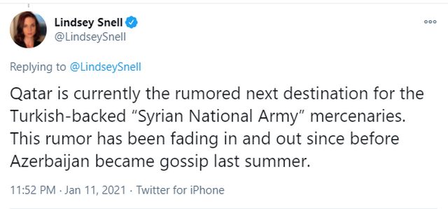 Την πολύ ενδιαφέρουσα πληροφορία ότι, τζιχαντιστές μισθοφόροι από τη βόρεια Συρία θα μεταφερθούν στο Κατάρ, μετέδωσε μέσω Twitter η Αμερικανίδα ερευνήτρια δημοσιογράφος και πολεμική ανταποκρίτρια Λίντσεϊ Σνελ, η οποία αποδεδειγμένα έχει καλές πηγές στις γραμμές των τζιχαντιστών και συνήθως επιβεβαιώνεται.