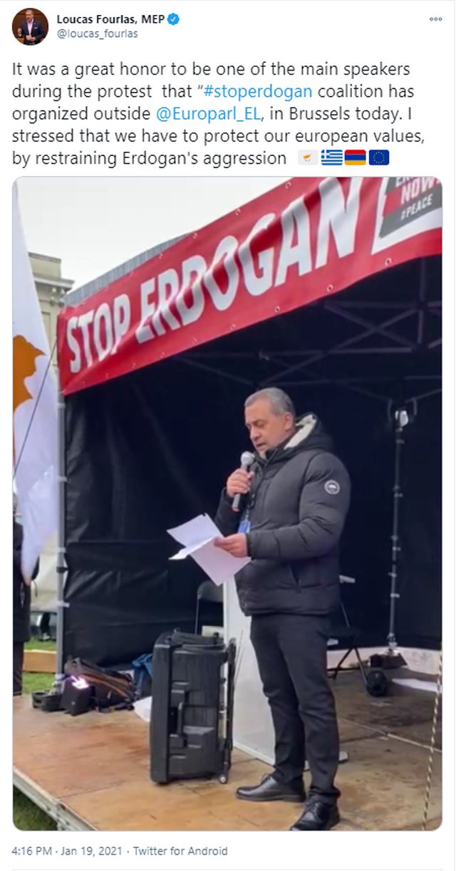 «Ήταν μεγάλη τιμή να είμαι ένας από τους κύριους ομιλητές κατά τη διάρκεια της διαμαρτυρίας που οργάνωσε σήμερα στις Βρυξέλλες, έξω από το Ευρωπαϊκό Κοινοβούλιο, ο συνασπισμός “STOP ERDOGAN”», γράφει σε ανάρτησή του στο Twitter ο Ελληνοκύπριος βουλευτής και συνεχίζει: