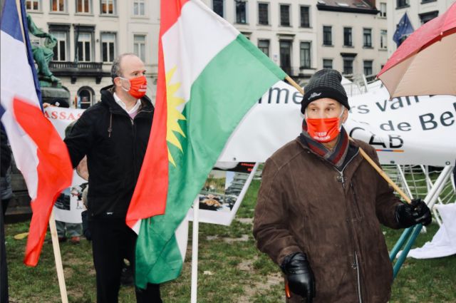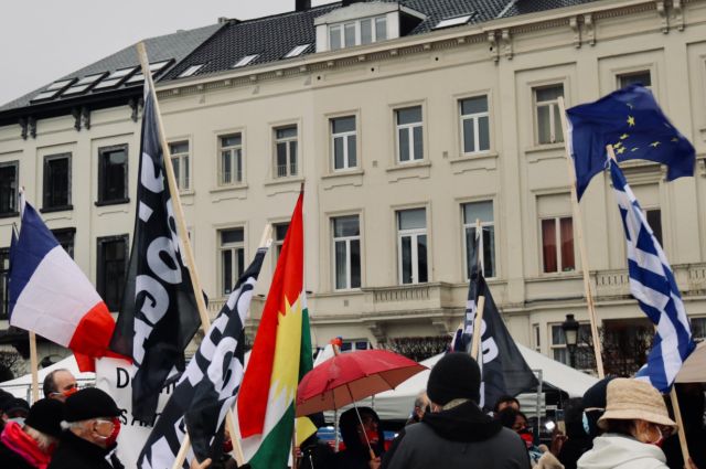 Οι συγκεντρωμένοι κρατούσαν τις σημαίες Ευρωπαϊκής Ένωσης, Ελλάδας, Κύπρου, Γαλλίας, Αιγύπτου, Ασσυρίας, Κουρδιστάν και κουρδικών οργανώσεων.