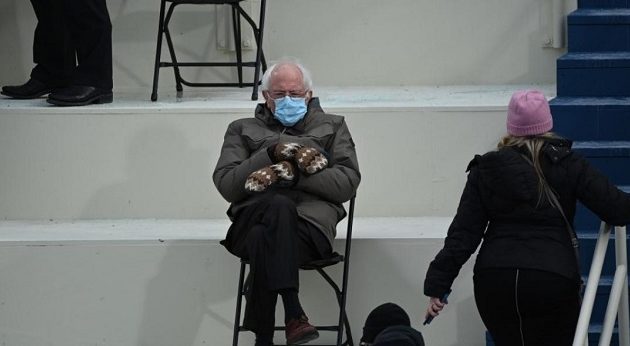 Ο Μπέρνι Σάντερς «τυλιγμένος» με χειμωνιάτικο μπουφάν, με σταυρωμένα τα χέρια και τα πόδια, φορώντας μάλλινα χειροποίητα πλεκτά γάντια, με την τυπική χειρουργική μπλε μάσκα προσώπου, κάθεται σε μια πλαστική καρέκλα, απομακρυσμένος από τους υπόλοιπους παρευρισκόμενους.