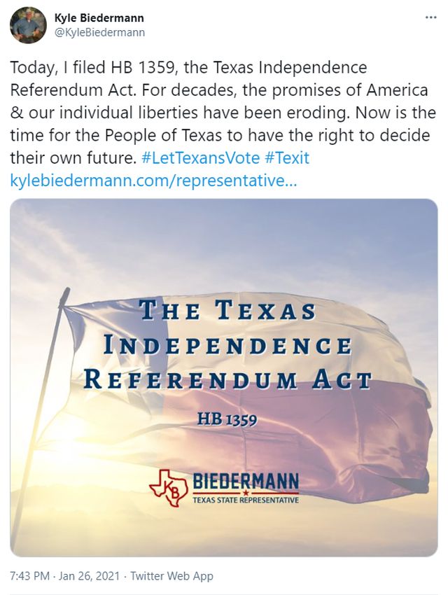 Ο βουλευτής Κάιλ Μπίντερμαν (Kyle Biedermann), Ρεπουμπλικανικός, μέλος της Βουλής των Αντιπροσώπων του Τέξας, ο οποίος συμμετείχε στην πορεία προς το Καπιτώλιο στις 6 Ιανουαρίου μαζί με οπαδούς του Ντόναλντ Τραμπ, κατέθεσε την περασμένη εβδομάδα ένα νομοσχέδιο για τη διενέργεια δημοψηφίσματος για την απόσχιση του Τέξας από τις Ηνωμένες Πολιτείες, μεταδίδει το NewsWeek.