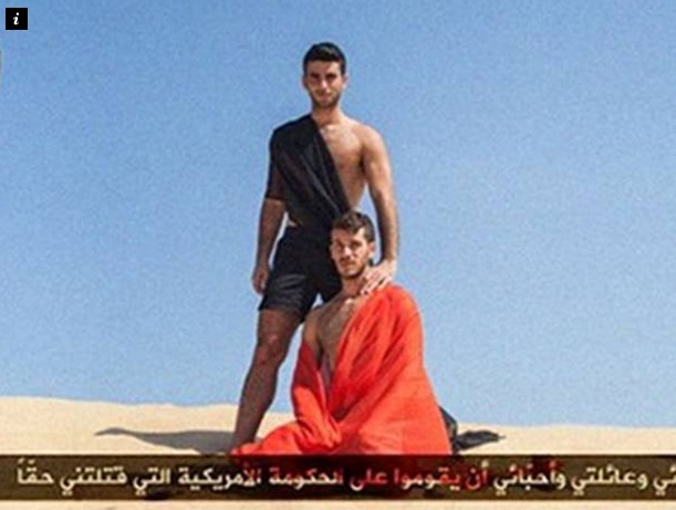 Ένας άνδρας στο ρόλο του εκτελεστή στέκεται όρθιος με μία ανάλαφρη κελεμπία πίσω από έναν άλλο που είναι γονατισμένος με το κεφάλι του να φτάνει στα επίμαχα σημεία του πρώτου και ντυμένος με την κλασσική πορτοκαλί φόρμα που φορούν οι όμηροι του ISIS.