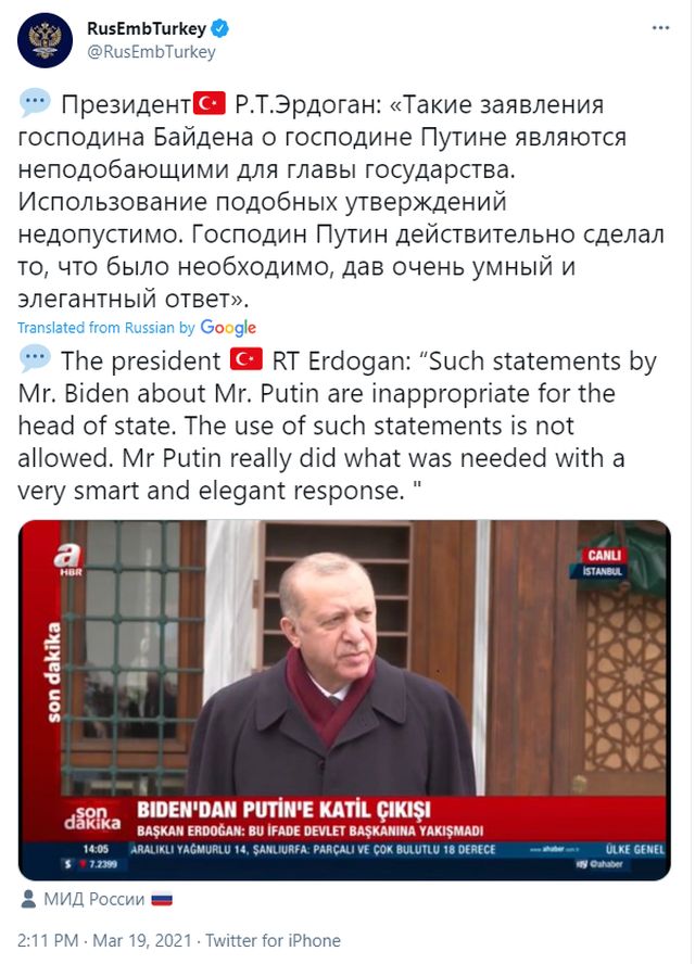 Πανηγυρίζει η Ρωσική Πρεσβεία στην Άγκυρα με τη δήλωση Ερντογάν, με την οποία συντάχθηκε στην πλευρά του Πούτιν κατά Μπάιντεν. Πρόκειται για πολύ σημαντική εξέλιξη, που επηρεάζει συνολικά τις σχέσεις της Τουρκίας με τη Δύση και επιβεβαιώνει τον άξονα Βερολίνου, Μόσχας και Άγκυρας ενάντια στην Ουάσιγκτον και τη συμμαχία της Ανατ. Μεσογείου.