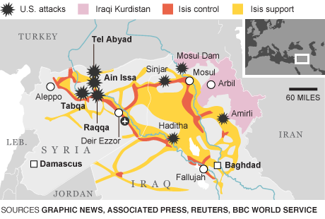 Στο χάρτη που ανήρτησε η βρετανική Telegraph μπορείτε να δείτε αναλυτικά όλα τα χτυπήματα που έχουν γίνει μέχρι στιγμής από τις δυνάμεις που μάχονται τους τζιχαντιστές από το Ισλαμικό Κράτος