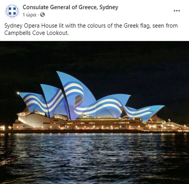 «Η εμβληματική Όπερα του Σύδνεϋ φωταγωγημένη με τα χρώματα της ελληνικής σημαίας προς τιμήν της επετείου των 200 ετών από την Επανάσταση του 1821», έγραψε το υπουργείο Εξωτερικών στη σελίδα του στο Facebook.