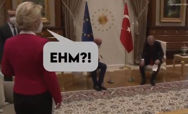 Τον γύρο του κόσμου κάνει βίντεο με την κ. Ντερ Λάιεν να στέκεται όρθια και αμήχανη μπροστά στον πρόεδρο του Ευρωπαϊκού Συμβουλίου, Σαρλ Μισέλ και τον Τούρκο πρόεδρο, καθώς δεν είχε προβλεφθεί θέση για εκείνη στην αίθουσα συσκέψεων στο προεδρικό μέγαρο της Τουρκίας.