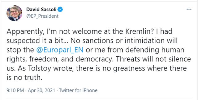 Ο πρόεδρος του Ευρωπαϊκού Κοινοβουλίου Νταβίντ Σασόλι καταδίκασε την απόφαση της Μόσχας να επιβάλει κυρώσεις εναντίον και εναντίον άλλων επτά Ευρωπαίων αξιωματούχων επειδή υπερασπίσθηκαν τον αντικαθεστωτικό Αλεξέι Ναβάλνι και ζήτησαν την απελευθέρωσή του.