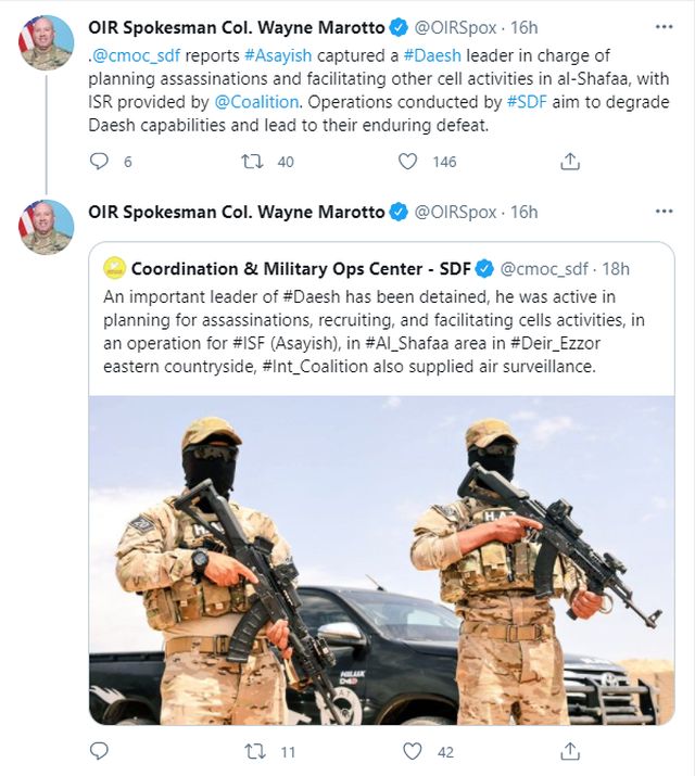 Ο συνταγματάρχης Μαρότο, ο εκπρόσωπος του Διεθνούς Συνασπισμού, δήλωσε σε ένα tweet τη Δευτέρα ότι οι επιχειρήσεις που διεξήγαγαν οι SDF στοχεύουν στην «υποβάθμιση των δυνατοτήτων του Ισλαμικού Κράτους» και στη διαρκή ήττα του.
