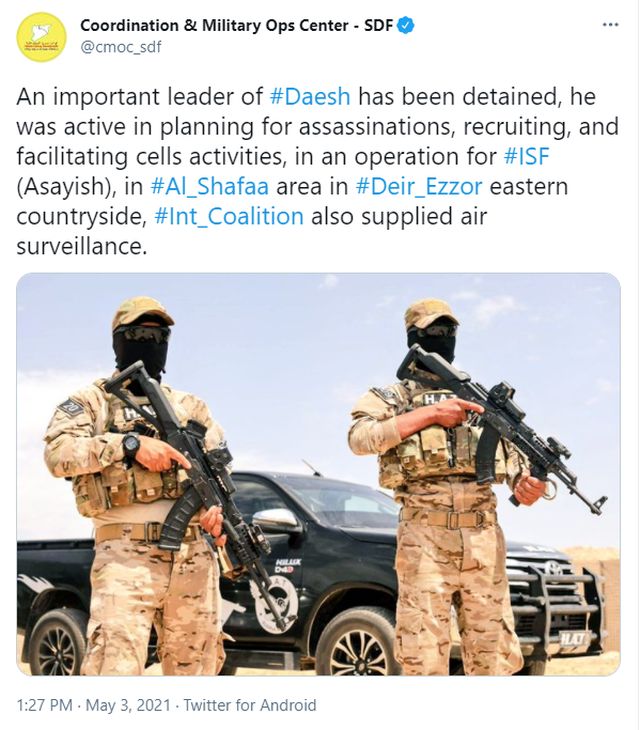 Οι SDF σημείωσαν ότι οι (κουρδικές) δυνάμεις εσωτερικής ασφάλειας της βορειοανατολικής Συρίας, κοινώς γνωστές ως Ασάγις, ηγήθηκαν της επιχείρησης, η οποία πραγματοποιήθηκε στην Αλ Σαφάα, στην ανατολική ύπαιθρο της επαρχίας της Ντέιρ αλ Ζουρ, με αεροπορική υποστήριξη από τον Διεθνή Συνασπισμό ενάντια στο Ισλαμικό Κράτος υπό την ηγεσία των ΗΠΑ.