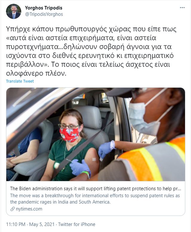 Τους αρνητές της απελευθέρωσης της πατέντας των εμβολίων «περιέλαβε» με δύο αναρτήσεις του στο Twitter ο Γιώργος Τριπόδης, καθηγητής Βιοστατιστικής στο Πανεπιστήμιο της Βοστώνης.