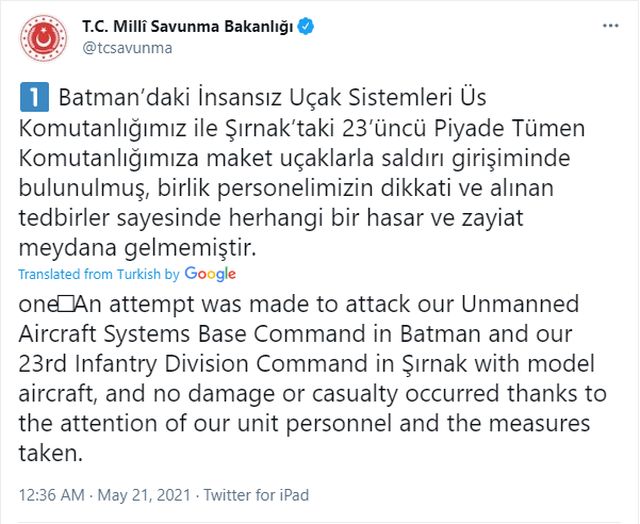 Λίγο μετά τα μεσάνυχτα στις 00.30 της 21ης Μαΐου, το τουρκικό υπουργείο Άμυνας ανακοίνωσε ότι επιχειρήθηκαν νέες επιθέσεις ντρον στη διοίκηση της βάσης μη επανδρωμένων τουρκικών αεροσκαφών (ντρον) στη Μπατμάν και στη 23η Διοίκηση Πεζικού στο Σιρνάκ, επίσης πόλεις του τουρκικού Κουρδιστάν.