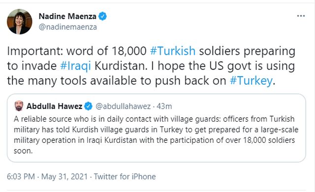 Η Τουρκία ετοιμάζει εισβολή στο ιρακινό Κουρδιστάν με μία δύναμη 18.000 ανδρών, γράφει στο Twitter η Ναντίν Μαένζα της αμερικανικής USCIRF (United States Commission on International Religious Freedom – Επιτροπή των Ηνωμένων Πολιτειών για τη Διεθνή Θρησκευτική Ελευθερία), αναμεταδίδοντας ανάρτηση του Αμπντουλά Χαουέζ.