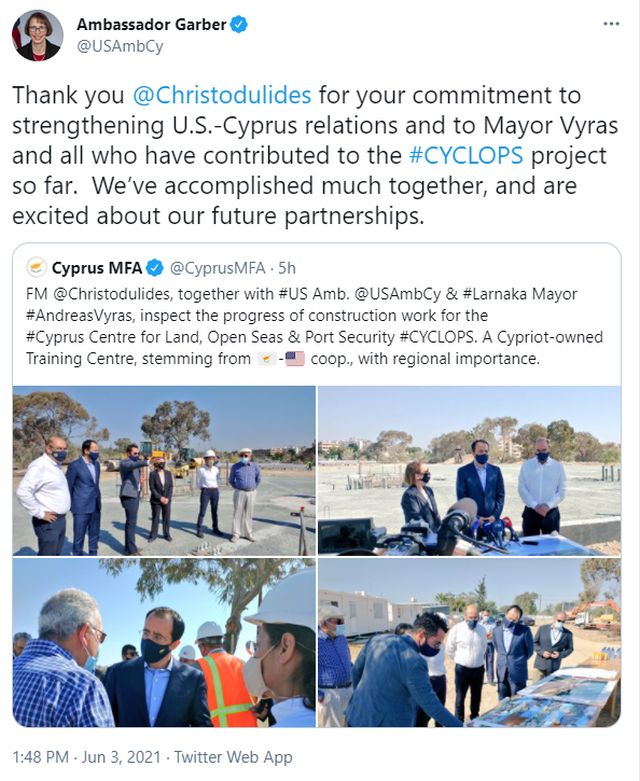 «Το Κέντρο CYCLOPS αντικατοπτρίζει την αυξανόμενη συνεργασία μεταξύ των Ηνωμένων Πολιτειών και της Κυπριακής Δημοκρατίας. Όπως ανέφεραν οι Υπουργοί Εξωτερικών της Κύπρου και των ΗΠΑ (Χριστοδουλίδης και Μπλίνκεν) αυτή την εβδομάδα, έχουμε κοινή δέσμευση για μεγαλύτερη σταθερότητα, ασφάλεια και ευημερία στην περιοχή της Ανατολικής Μεσογείου», δήλωσε η πρέσβης των ΗΠΑ στην Κύπρο Τζούντιθ Γκάρμπερ.