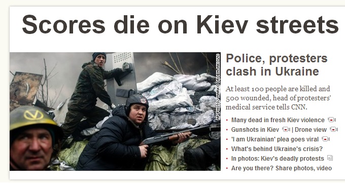 Το CNN μεταδίδει, σύμφωνα με τα όσα ισχυρίζονται οι πρώτες βοήθειες των διαδηλωτών, ότι αριθμός των νεκρών στο Κίεβο έχει εκτοξευθεί στους 100, οι τραυματίες υπολογίζονται στους 500.