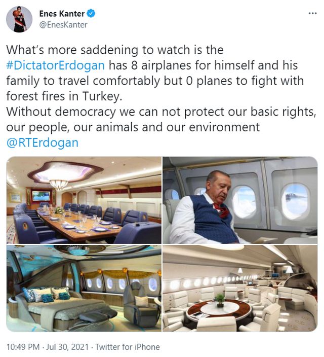 Ο αντικαθεστωτικός μπασκετμπολίστας, Ενές Καντέρ, που ζει στην Αμερική, επεσήμανε σε ανάρτησή του στο Twitter ότι ο Ερντογάν έχει οκτώ (8) προεδρικά αεροσκάφη και μηδέν (0) πυροσβεστικά.
