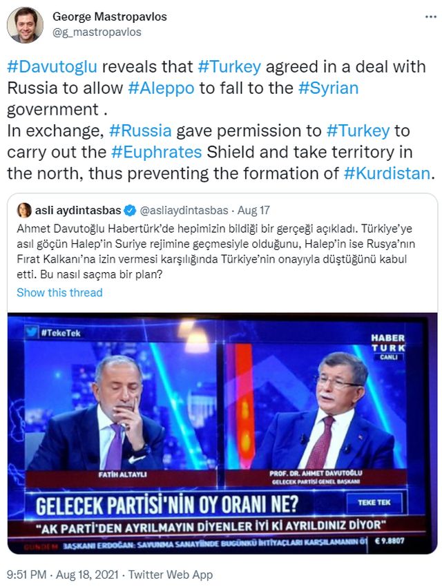 Ο Αχμέτ Νταβούτογλου, μιλώντας στο Habertürk, υποστήριξε ότι το Χαλέπι «έπεσε» στο συριακό καθεστώς με την έγκριση της Τουρκίας σε αντάλλαγμα την άδεια της Ρωσίας για να πραγματοποιήσει η Τουρκία την πρώτη της εισβολή σε συριακό έδαφος, την επιχείρηση «Ασπίδα του Ευφράτη» (24 Αυγούστου 2016 – 29 Μαρτίου 2017).