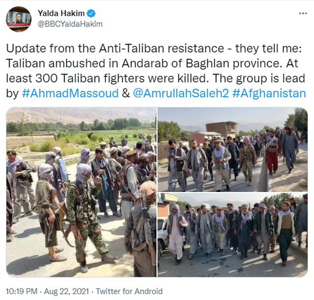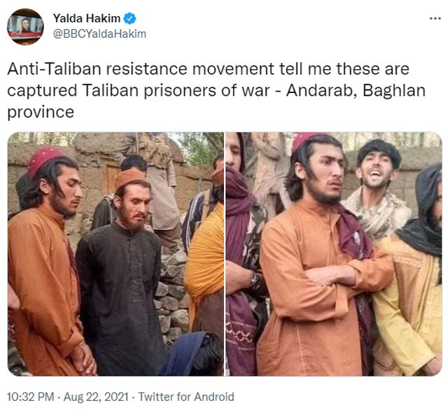 Η δημοσιογράφος του BBC, Γιάλντα Χακίμ, δημοσιεύει στον λογαριασμό της στο Twitter φωτογραφίες των Ταλιμπάν που αιχμαλωτίστηκαν σε αυτή τη μάχη, οι οποίοι σύμφωνα με τον δημοσιογράφο Μπάμπακ Τακβαίε είναι 50 στον αριθμό.